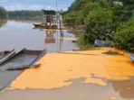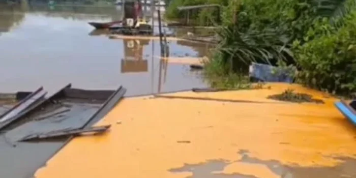 Sambas – Tumpahan Crude Palm Oil (CPO) dari sebuah tongkang yang diduga mencemari aliran sungai di Dusun Senabah, Desa Semangak, Kecamatan Sejangkung,